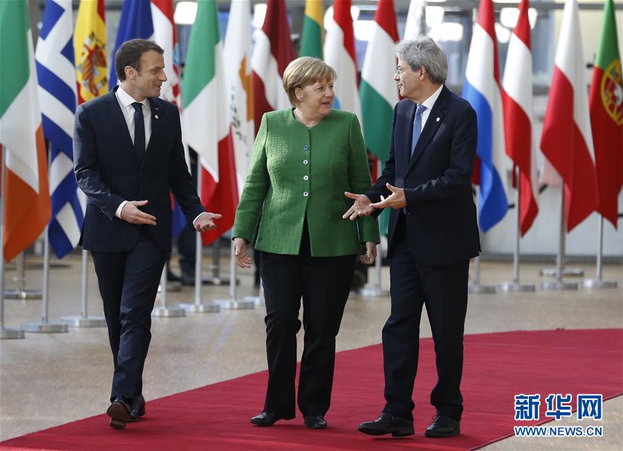 2月23日,在比利時(shí)首都布魯塞爾,法國總統(tǒng)馬克龍(左)、德國總理默克爾(中)和意大利總理真蒂洛尼抵達(dá)峰會(huì)會(huì)場。