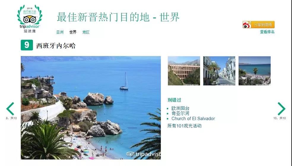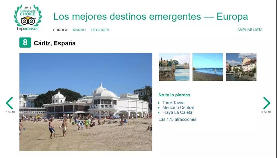 西班牙的兩座城市也分別進入了歐洲最佳熱門目的地和世界最熱門旅游目的地榜單:內(nèi)爾哈,位列歐洲第四,世界第九;加的斯,位列歐洲第八。