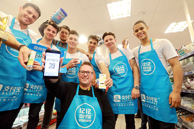 當(dāng)?shù)貢r間12月11日,德國“網(wǎng)紅”阿福(前排中)在法蘭克福市中心一家Rossmann日化連鎖為“雙12”促銷活動助陣。受到中國國內(nèi)民眾歡迎的“雙12”購物狂歡今年由支付寶引入德國。