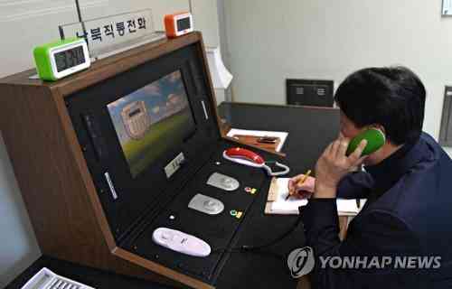 當?shù)貢r間1月3日下午3點34分,在板門店聯(lián)合警備區(qū)聯(lián)絡(luò)事務(wù)所,韓方聯(lián)絡(luò)官拿起韓朝直通電話的話筒與朝方通話。(圖片來源:韓聯(lián)社)