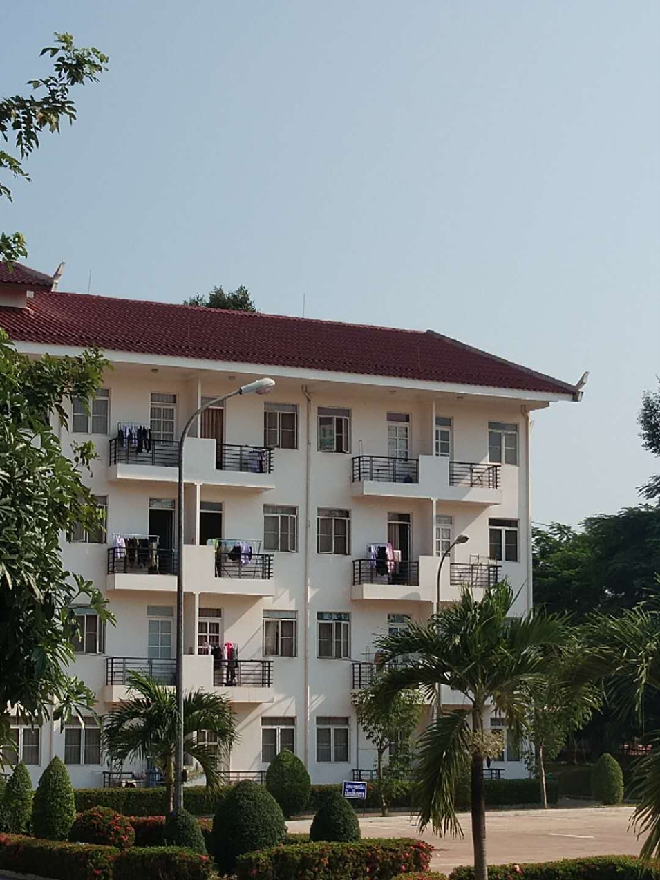郁郁蔥蔥的東南亞特色的植被中,紅白相間的老撾語(yǔ)教學(xué)樓十分醒目,跳躍在金色陽(yáng)光下的東南亞特色建筑教室,顯得干凈整潔。