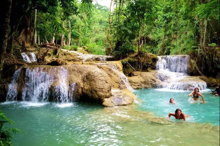 這里是一座寬廣的多層瀑布,瀑布總高100米,瀑布從石灰石山峰傾瀉而下,注入下面一系列清涼、翠綠色的水潭中。三層瀑布傾瀉而下,形成多個泛著藍綠色光澤的水潭,這里的景色像極了九寨溝的五彩池。陽光透過樹葉的間隙灑在涓涓溪流中,溪面就好像是一片片破碎的鏡子,點點地閃爍魚鱗般的光,如夢似幻,讓人迷醉。在這里最熱門的活動莫過于大樹繩索跳水,在水潭內(nèi)嬉戲不要著急上岸,可以安靜的在水里享受一下純天然免費小魚SPA。