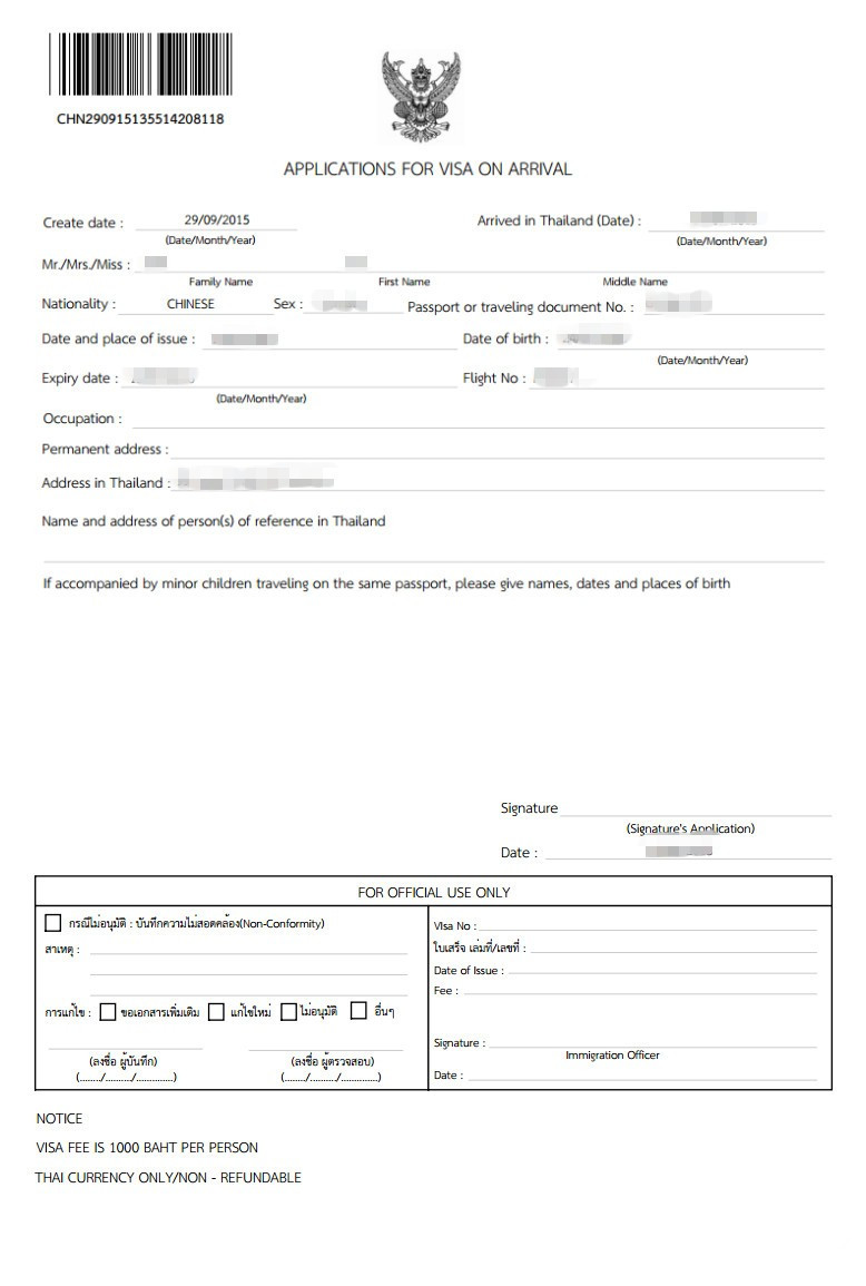 即可開始在線填寫落地簽表格。游客只需在填寫完成后將此在線表格打印出來,連同相關落地簽基本文件一同在泰國各國際機場落地簽柜臺辦理手續(xù)即可入境。